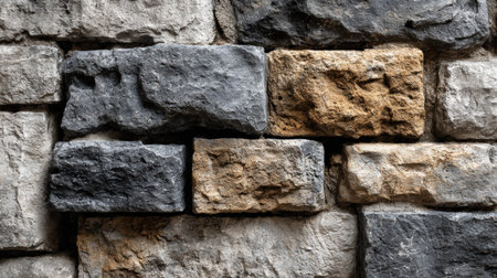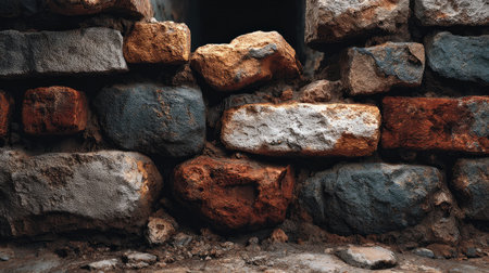 A close-up view of a textured wall displaying weathered stones and bricks in a variety of colors, showcasing natural imperfections and visual interest.