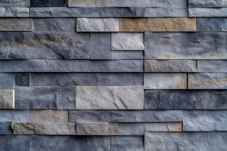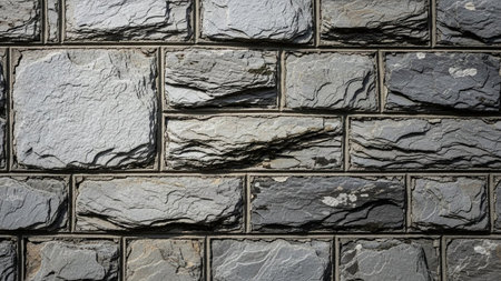 Detailed close-up of a grey slate stone wall showcasing rough layered textures and distinct grout lines between blocks.
