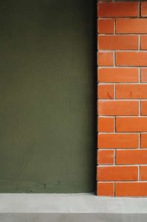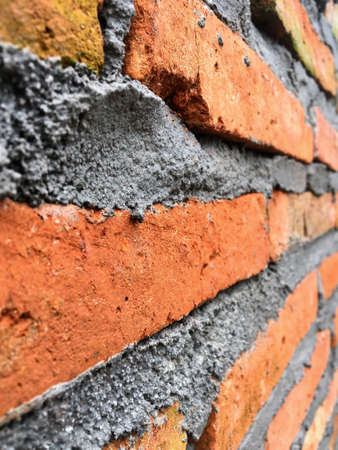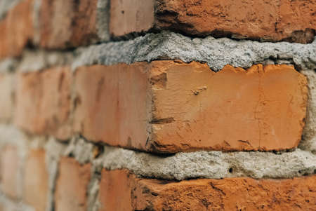 Side angle of a red brick wall corner. Close up view of cracked weathered brickwork material. Modern interior design, unique perspective. Loft like room style at home. Dark street or alleyway outside.