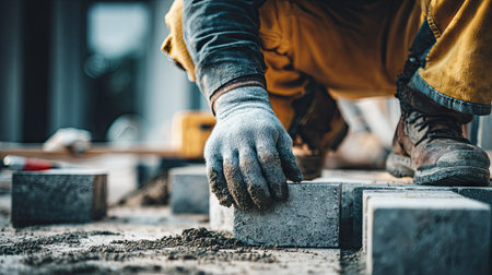 A construction worker carefully places bricks with precision on a building site. The sun shines brightly, illuminating the hard work involved in the masonry.