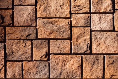 Wall made of cement and irregularly shaped stones. Architectural detail, closeup. Texture, material background. Orange bricks.