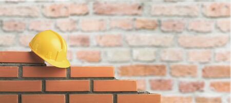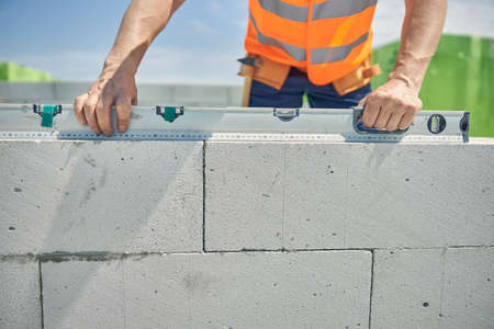 Industrial bricklayer installing bricks on construction site. Detail of hand adjusting bricks.