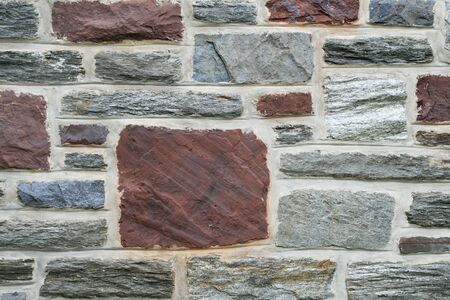 stone wall detail with red sandstone and gray wissahickon schist blocks