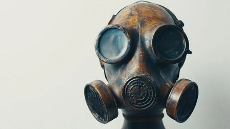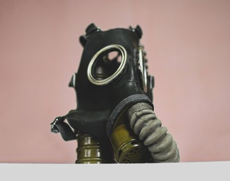 Close up of Protective gas mask with a filter on a gray dirty background, doomsday, virus