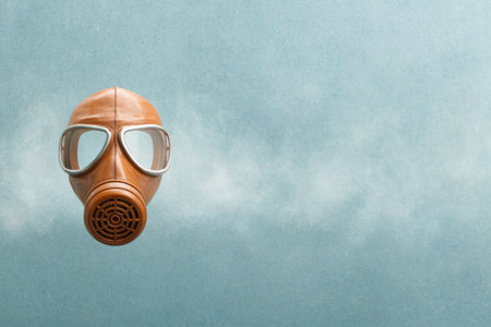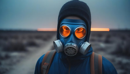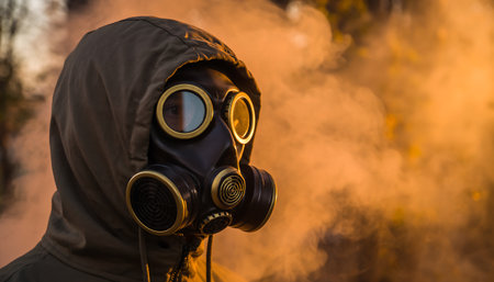 A person wearing a gas mask stands amidst a cloud of orange smoke, creating a striking and thought-provoking image of protection and potential danger.