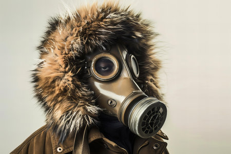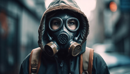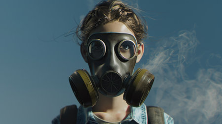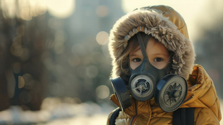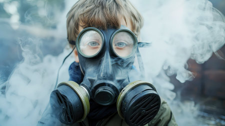A child wears a gas mask against a backdrop of smoke, highlighting the issue of air pollution and its impact on future generations. AI generated.