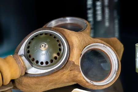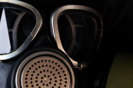 Old military officer's gas mask, which was in service with the Soviet army at the end of the 20th century, close-up on a black background