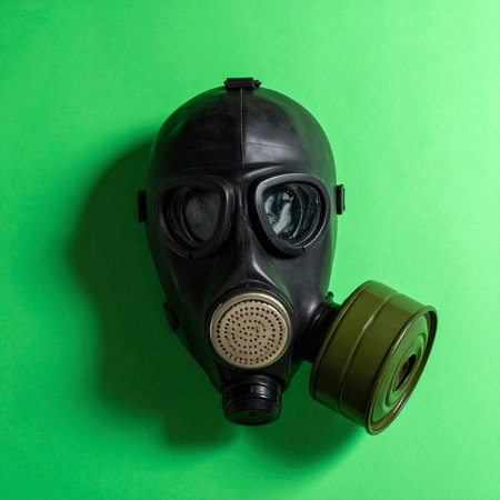 A stark, top-down view of a vintage gas mask against a vibrant green background.