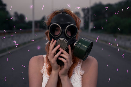 Woman wearing a real anti-pollution, anti-smog and viruses face mask; dense smog in air.