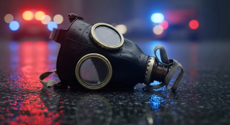 Black gas mask on wet ground with emergency light reflections. Chemical disaster or natural catastrophe concept. Evacuation.