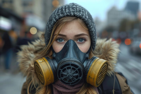 A close-up shot of a young woman wearing a protective mask and glasses in a polluted smoky environment.