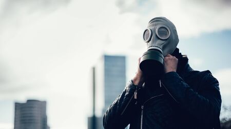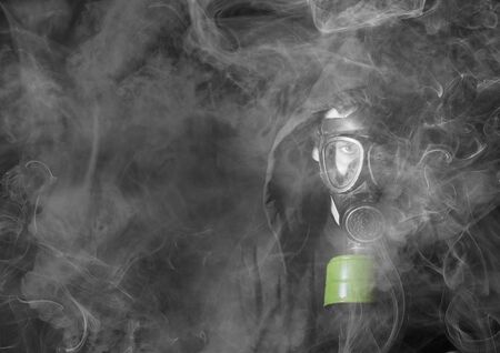 Poisonous fumes of smoke hover around a man in a gas mask. The concept of working at a chemical plant. Hazardous production.