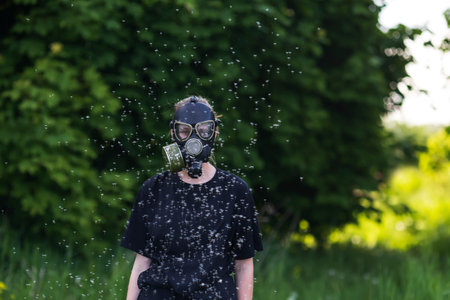 girl in a gas mask protects herself from allergies from flying dandelion seeds in a spring park