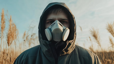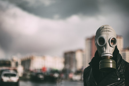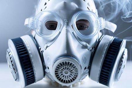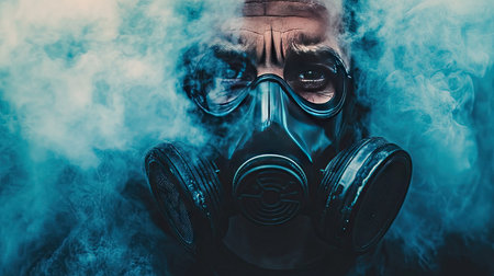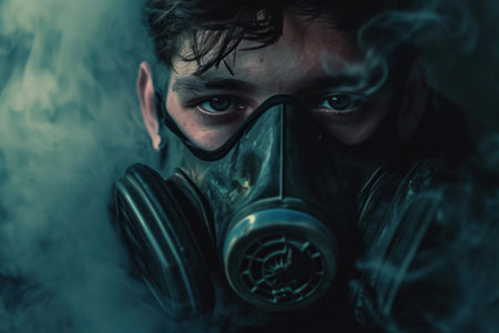 A man wearing a gas mask is standing in front of a cloud of smoke. Concept of danger and urgency, as the man is trying to protect himself from the harmful effects of the smoke