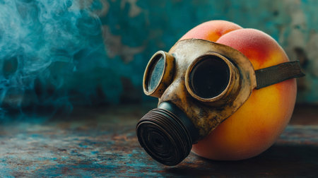 Close up view of a peach wearing a vintage gas mask, set against a dark, smoky background. The image evokes a sense of environmental concern and the fragility of nature.
