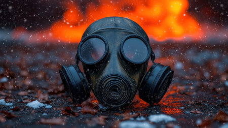 A gas mask lies partially buried in snow, surrounded by fiery colors in the distance.