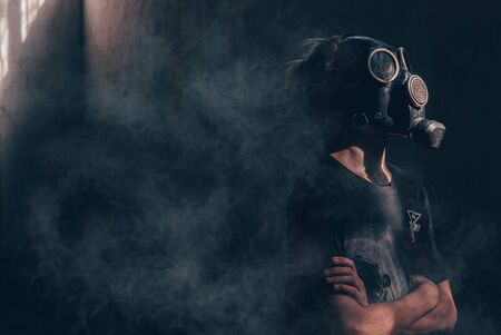 Environmental disaster. Post-apocalyptic survivor in gas mask on a dark background. Dramatic portrait of a man wearing a gas mask. Means for radiation protection. Selective focus