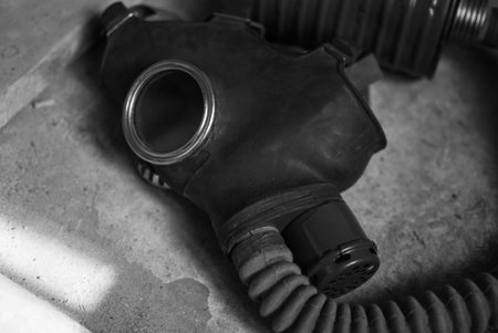 Closeup of an old soviet green gas mask laying in the storage. Black and white