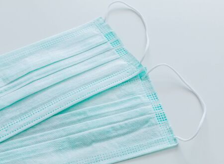 Two Surgical mask with rubber ear straps on white wooden background. Typical 3-ply surgical mask to cover the mouth and nose. Procedure mask from bacteria. Protection concept
