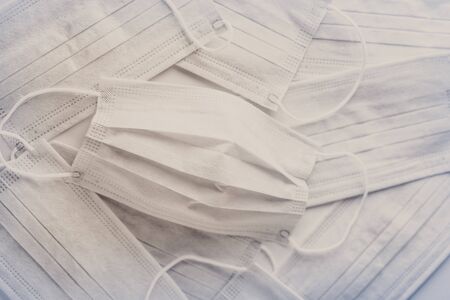 A lot of medical face dust masks, disposable FFP3 respirators protective mouth filter mask. Concept of coronavirus, sars, air pollution, virus, flu, infectious diseases and precautions. A stock masks.