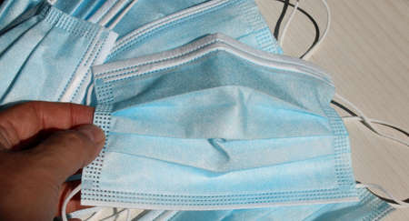 Used blue surgical protective masks. Coronavirus (COVID-19) hysteria is leading to mass mask shortages in the beginning of 2020.