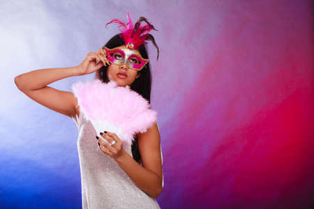 Holidays, people and celebration concept. African woman with carnival venetian masks holding feather fan in hand over festive background.