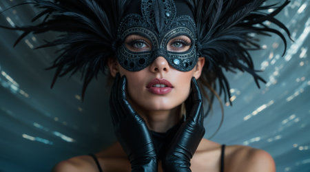 Artistic portrait featuring an ornate black masquerade mask adorned with dramatic feathers and jewels, paired with black leather gloves against ethereal teal background with bokeh effects.