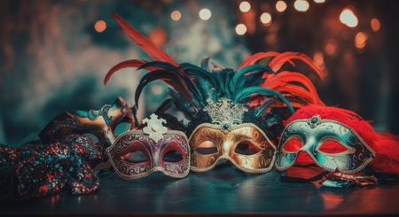 Elegant Masquerade Ball Celebration with Ornate Masks and Festive Lights. Concept of Mystery, Sophistication. Purim.