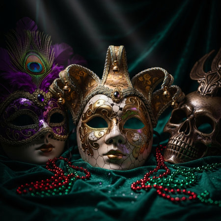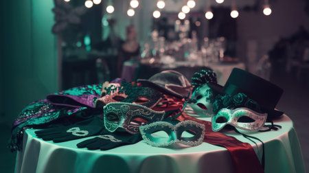 A vibrant display of colorful masquerade masks and accessories arranged on an elegantly set table, creating a festive atmosphere. The soft lighting and decorative elements enhance the allure of a celebration or party