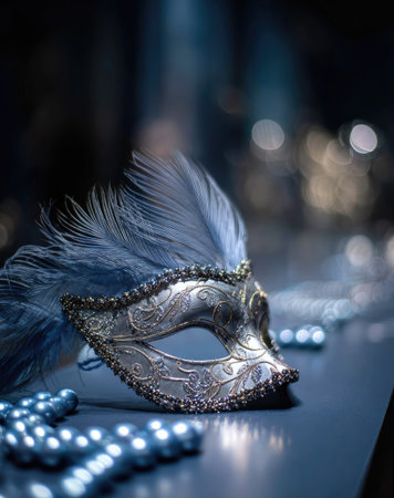 A close-up view presents a detailed silver masquerade mask adorned with delicate blue feathers. The composition showcases the mask prominently, with a soft-focus background of bokeh lights. The image conveys a sense of mystery and luxury, lending itself to a variety of editorial and commercial applications.
