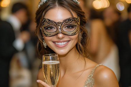 A young woman with wavy hair rests her hand on a glass of champagne, wearing a golden mask. The background is filled with soft lights, creating a celebratory atmosphere during an evening event.