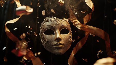 A stunning gold mask with decorative elements suspended in mid-air, surrounded by falling golden confetti and elegant ribbons, creating a festive atmosphere.