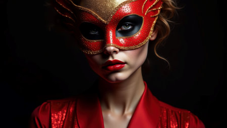 Female caucasian young wearing red masquerade mask in low light portrait. That the image is generated using AI