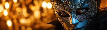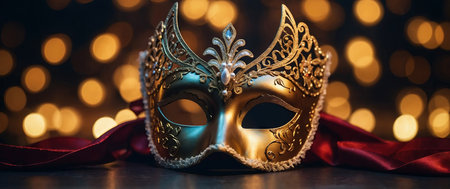 AI Generated. Luxury venetian mask on dark godlen bokeh background New year and christmas party celebration design banner