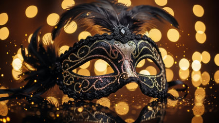 Ornate black Venetian mask, gold detail, feathers, bokeh lights