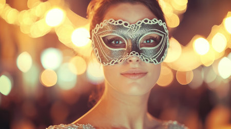 Enigmatic woman with masquerade mask. Elegant formal ball with festive celebration.