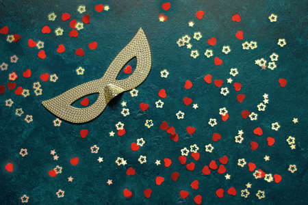Carnival mask and red glitter confetti. Top view, Close up on blue background