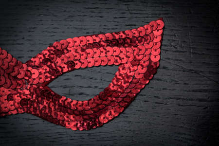 Carnival time. Venetian mask, red with feathers, on black shiny background, copy space