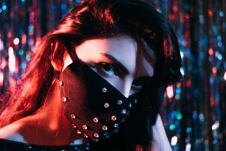 Pandemic party. Neon light portrait. Fashion trend 2021. Mysterious woman in black gothic fabric protective face mask with crystal ornament in red blue glow on blur shiny tinsel background.