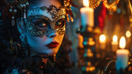 A close-up of a woman wearing a detailed, ornate masquerade mask, illuminated by candlelight. Ideal for high-fashion or Halloween themes.