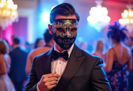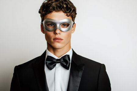 Portrait of a stylish man wearing a silver masquerade mask and a black tuxedo with a bow tie, exuding mystery and sophistication