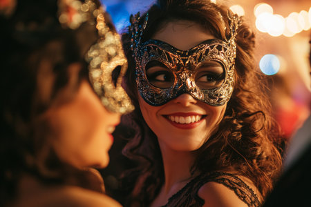 Elegant women adorned in venetian masks and costumes at a festive evening carnival celebration