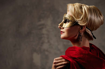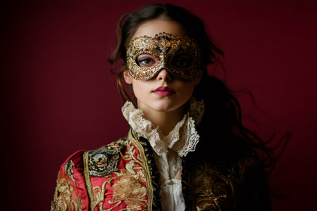 Young woman wearing a beautiful venetian mask and renaissance costume posing for a portrait against dark red background