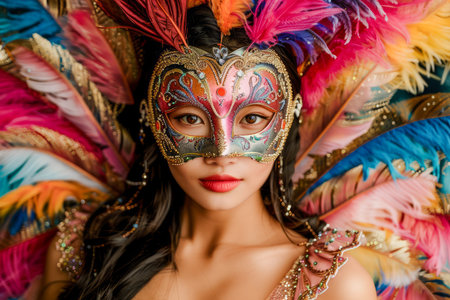 Vibrant Carnival Woman with Extravagant Feather Costume and Colorful Mask at Festive Celebration AI Generative