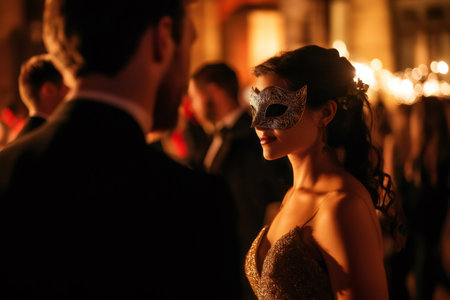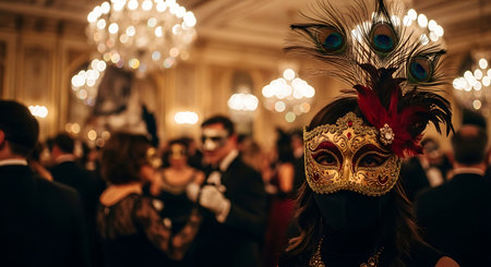 Elegant woman wearing a filigree mask is attending a masquerade ball, surrounded by other guests