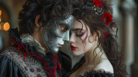 Romantic couple embracing at a masquerade ball, woman wearing an ornate venetian mask, man gently kissing her forehead, celebrating love and intimacy in historical period costumes