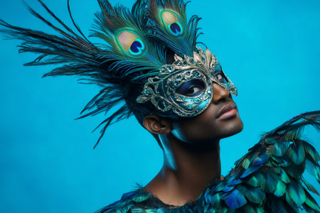 Portrait of a male model wearing an elegant peacock feather mask and costume, posing against a vibrant blue backdrop