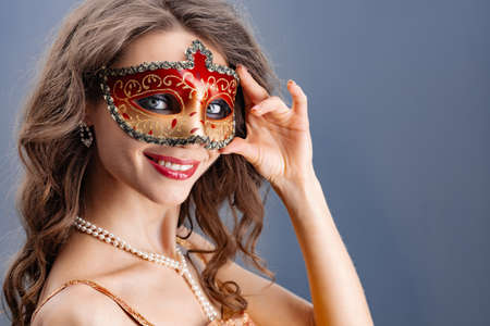 A young woman puts on a carnival mask. Closeup portrait. - Image
