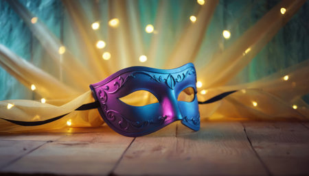 Purple carnival mask on wooden table with garland lights background