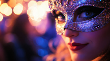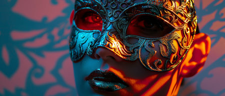 The Venetian Carnival. Close-up of a woman in an ornate carnival mask. Bright colors convey an atmosphere of celebration and luxury.